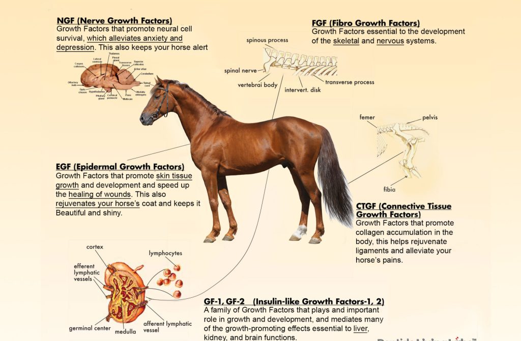 Growth factors interact with biochemical pathways that drive the repair and regeneration of joint, skin, muscle tissues, hormone regulation and more. This results in increased vitality to the horse. They promote the production of collagen and elastic fibers, which are essential for maintaining joint flexibility and keeping skin soft and supple.